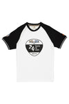 This t-shirt , made of cotton, offers optimal comfort thanks to its soft and breathable material. It stands out with its black raglan sleeves and black round neck, contrasting elegantly with the white body of the t-shirt. The large “24 Heures du Mans” logo with checkered flags printed on the front adds an authentic and recognizable touch. An embroidered patch on the right sleeve adds an extra note of distinction. Ideal for all seasons, this tee is a must-have for any motorsport fan.