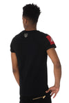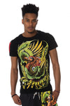 Represented on a black background, a magnificent colorful phoenix and decorated rhinestones.