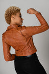 The crinkled effect and aged Kyoto Cognac 507 is the trendy touch you need to assert your style. This perfecto signed Oakwood is made of high-end sheepskin leather, in a very feminine, short, fitted cut.