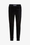 The fabric of the jogging pants is made of soft, pleasant-to-the-touch velvet panne fabric. Two pockets are visible on the sides and another is present on the inside. the rear. The collar rises to a height; the belt. It is elasticated. and adjustable by striped drawstring with stop catch. This cord passes through two silver metal eyelets. A branded badge in the shape of a metallic coat of arms is present on the top of the left leg.