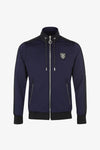 This sweatshirt is equipped with long black ribbed sleeves as well as its size. Its high collar is also black and gives rise to the long matching bands placed along the entire length of the sleeves. These are printed with the brand logo. On the side On the left chest, the brand badge is sewn in a metallic effect which sets the tone for the long axial metal zip, the eyelets which allow the drawstring to pass through at the collar and the two zipped side pockets.