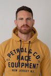 Built to; 80% high-end cotton and 100% cotton. 20% polyester, this brushed jacket on the reverse combines comfort and lightness. There are ribbed finishes at the ends of the long sleeves and at the sides. the size for maximum support and protection. The black PETROL logo contrasts elegantly with the predominant yellow. The hood confirms the relaxed touch, with its contrasting drawstring. A kangaroo pocket appears under the logo. It tops a branded label. PETROL at the bottom on the side.