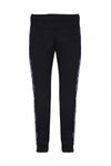 These pants with a 70% cotton and 30% polyester black is contrasted. by a band with a printed silver along each leg.