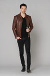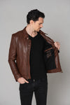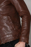 The Norris Green Brown has a regular cut. The skin has an aged and mottled appearance. The thickness of the leather provides good support to the shoulders. The central zip and sleeves have a worn, slightly golden color. The pockets have a snap. The lining is lightly padded.