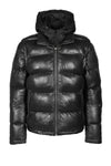 Black leather down jacket with removable sleeves and hood - Image n°1