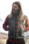 Designed for outdoor activity enthusiasts, this sleeveless down jacket combines thick cowhide leather with buffalo leather shoulders for superior resistance and comfort. The plaid lining provides optimal comfort while adding a touch of distinctive style. With a regular cut, it adapts to all body shapes and allows you to easily layer your clothes. Practical, it has two pockets to keep your essentials close at hand. Its black and brown dual-material design highlights a virile and robust look.