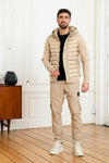Its pretty beige color highlights its beauty, as do its sewing stitches. The quilted effect This jacket is also magnificent. The ribbed bands sewn on the waist and the ends of the long sleeves are reminiscent of the configuration of a teddy. This down jacket has a concealed button placket on which a long metal zip is sewn which ensures on-axis closure. This button placket is flocked with the brand name printed on it. in white. A large hood adjustable with a black cord will cover the entire body. marvel your head. Two pockets are sewn on each side, and another is placed in the internal lining.