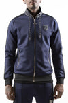 This sweatshirt is equipped with long black ribbed sleeves as well as its size. Its high collar is also black and gives rise to the long matching bands placed along the entire length of the sleeves. These are printed with the brand logo. On the side On the left chest, the brand badge is sewn in a metallic effect which sets the tone for the long axial metal zip, the eyelets which allow the drawstring to pass through at the collar and the two zipped side pockets.