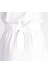 The round neck is embellished with a round neckline. with a border golden and two small, very feminine epaulettes with gold buttons are sewn continuously. of the hem of the tank top sleeves. The top has a zipper system. white and gold buttons similar to those which close both pockets flap sewn on the chest. The brand's metallic logo is also flocked. in gold color on the back. The elastic waist is complemented by a matching belt. tie as you wish.