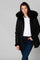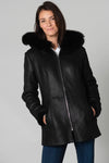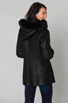 Magnificent long jacket in black shearling, tone on tone. Fixed hood is straight cut to fit any size. all body types.