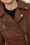 This women's jacket is designed for women. featured in a soft, lightweight sheepskin leather construction. We like its homogeneous grain and the « imperfections » natural features of its skin which highlight the surface of the leather. The perf style is obviously marked by by a notched collar à decorative metal snaps, as well as a beautiful asymmetrical zip closure in the center. The chest and hand pockets are zipped. With convenient zips at the wrists, they complete the metal details of this model. Let's not forget the double metal buckles at the back. barbs, present at the size.