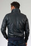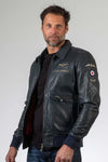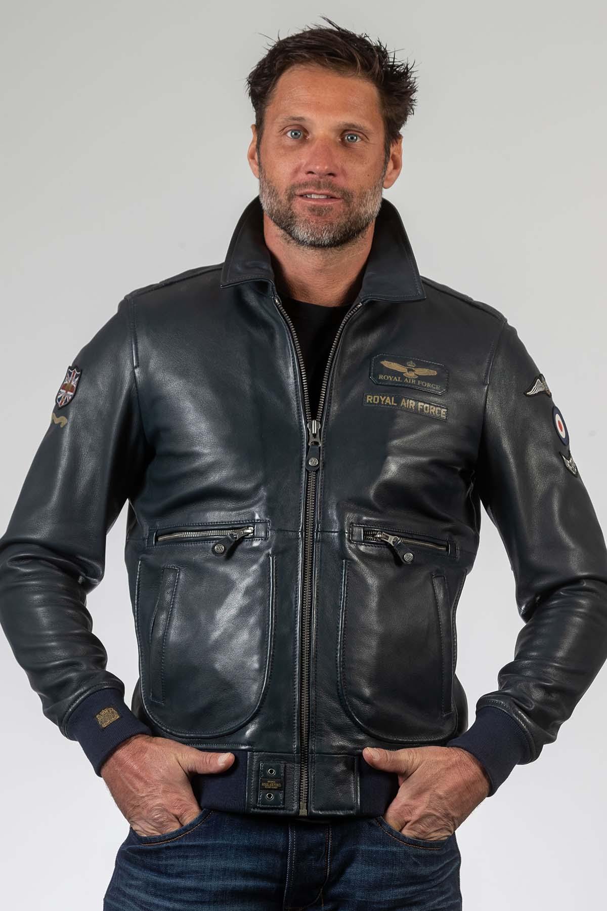 Discover the Trenchard Navy bomber jacket from Classic Legend Motors for men. This navy blue sheepskin leather jacket embodies a classic and timeless style, perfect for all seasons. With its iconic Royal Air Force patches, it is aimed at fans of military and vintage-inspired clothing.