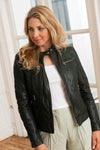 Discover the JOLYA LAMB VITA KHAKI jacket from Rose Garden, an essential for women's wardrobe. This jacket with a biker collar and regular cut, made of khaki-colored sheepskin, is both chic and biker, suitable for all seasons.