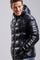 In its black color, its surface is shiny. It closes with a long metal zip that goes up to the high collar. The latter is equipped with a large hood with drawstring. The long sleeves are decorated with a band printed with the brand name and they end with an elastic ribbed band which ensures a better fit.