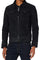 Its suede texture gives it a soft touch, while its navy blue color gives it a certain charm. With its shirt collar, this jacket closes along the axis with a long metal zip. The ends of the long sleeves and the waist are ribbed. Two zippered pockets flap are placed on each side of the flap. of the chest, while two raglan pockets are sewn on each side.