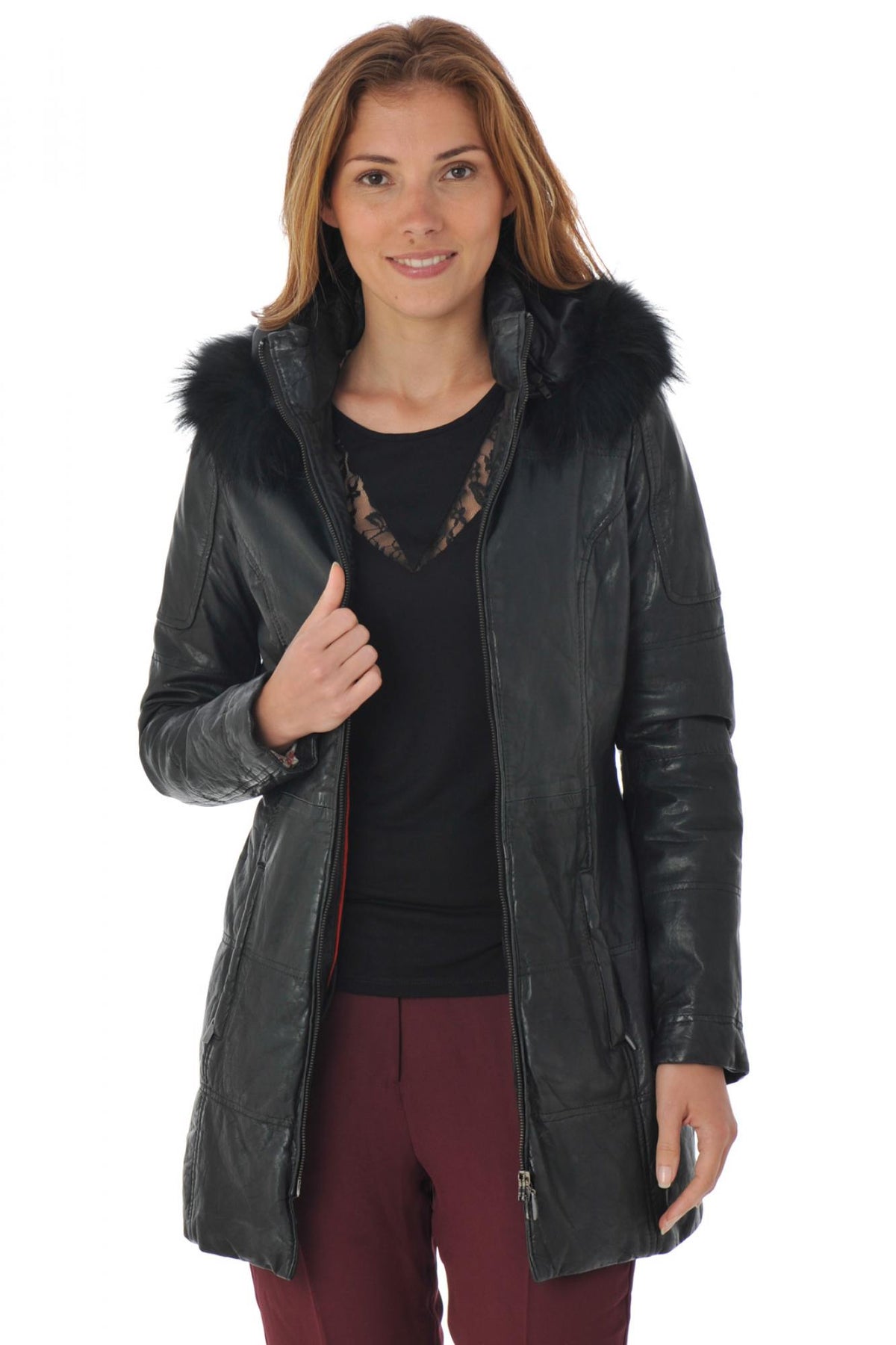 Removable hood with zipper adorned with leather. black raccoon fur.