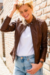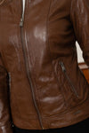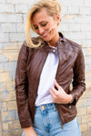 This biker-style jacket has a pretty officer collar that closes with a silver metal snap. Its sheepskin leather is of good quality; and its brown color will not leave anyone indifferent. We love its careful seams and topstitching down to the millimeter, as well as its fitted cut whose structure adds a touch of femininity. The closure is centered and zipped. The cuffs are also zipped for added comfort. comfort. 2 lower slanted pockets have zips and will be ideal for hand comfort.