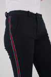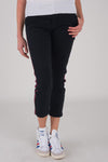 The jeans feature ultra-feminine cropped legs in a very designer innovative style. It closes at with the help of a button and a zip fly. The dark blue stretch fabric follows the morphology and structures a silhouette full of charm and character. There are 4 pockets in this model, including 2 pockets on the front and 2 others on the back. Very chic side braids in blue, red and silver run the length of the legs.