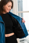 The JUTTA TRIPWAY ELECTRIC BLUE is ideal for adding a bold touch to your daily outfits or for evening outings. Easy to pair, this jacket pairs perfectly with black skinny jeans and ankle boots for a rock look, or can be paired with a simple black dress for an elegant contrast. For cooler days, layer it with a lightweight sweater. Its timeless style and distinctive color make it an ideal choice for any occasion where you want to stand out.