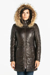 Discover timeless elegance with the Anouk Hood Lamb Orion Brown jacket from Rose Garden for women. This mid-length brown sheepskin leather coat is the perfect ally for a classic and refined style during the fall-winter season.