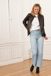 This jacket meets the standards of a biker collar jacket with its biker collar that can be closed with a strap with a snap button. A long metal zip ensures closure along the axis, while others ensure closure of the two side pockets and the ends of the long sleeves. The internal lining is decorated with a pretty pattern and a raglan pocket on the side. straight.