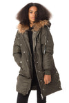 This coat has a hood entirely lined with very soft raccon, it has a zipper to separate it so the fur lines your shoulders and brings another style to the model.