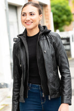 Bold and structured, the ISABELA HOOD BLACK jacket by Cityzen is a feminine perfecto that blends urban flair with functional details. Crafted from soft, refined black sheepskin, it features a removable hood and a flattering slimfit cut.
