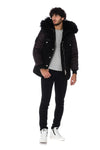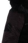 Fnuget hætte dekoreret med storslået sort vaskebjørnpels, aftagelig med trykknapper.