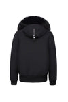 Fast, helforet hætte dekoreret med storslået sort prærieulvepels, aftagelig med lynlås og velcro.