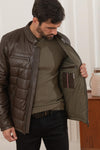 Denne jakke er naturligvis udstyret med en bikerkrave, der kan lukkes takket være trykknapper. En lang aksial metallynlås sikrer lukning. To raglanlommer med lynlås er syet på hver side af tasken. af brystet, mens to andre lodrette lommer er placeret på hver side. To små lommer er til stede på den khaki indvendige foring. En smuk quiltet effekt er givet à den ydre overflade, som minder om en dunjakke.