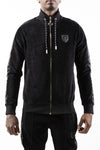 Denne sorte sweater har lange ærmer og er pyntet med en dobbelt sort læder-look-stribe syet på hver side. Linjen, manchetterne og den høje krave er ribbet, hvilket garanterer god holdbarhed. For at lette åbning og lukning; af denne sweatshirt er en metallynlås syet bagpå. fronten. Mærkemærket er belagt på bagsiden. på siden på venstre bryst.