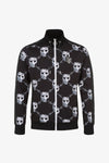 Vi finder et højkvalitets åndbart teknisk stretchstof. hvis hele overfladen er printet med hvide Jason-masker på sort baggrund. Vi genkender der; inspiration hentet fra mærkets ikoniske t-shirt. Kraven er rund og afslører en tofarvet snøre, der krydser 2 guldøjer. Livmoderhalsen er dannet ribbede kanter. Det samme gælder manchetterne på de lange ærmer og taljen. Det metalliske våbenskjold logotype Horspist er tacklet i brysthøjde, side af brystet til VENSTRE. To sidelommer er synlige i bunden af tøjet.