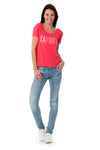 Denne t-shirt med et meget feminint look vil være perfekt til at bringe farve til dit outfit. dit outfit.