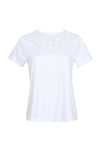 Med; Med en rund ribkrave, som giver den en vis soliditet, har denne feminine t-shirt korte ærmer samt et mærkelogo bagpå i kraven. Det ultimative er de dekorative mønstre, der er dannet på halsudskæringen og brystet af de gennembrudte og metal-look nitter.