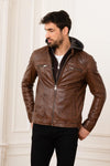 Denne førsteklasses jakke har en kvalitetsfårskindslæderkonstruktion med et vasket look. og den glatte overflade afspejler det omhyggelige håndværk. udført på delikat læderarbejde. Læderdetaljerne bidrager til udseendet. skønhed og det tidløse udseende af denne model. Mandarinkraven er i biker-stil. Han er klædt i en blød og aftagelig hætte, der giver dig mulighed for at ændre dit look, som du ønsker. daglige begrænsninger. Lynlåsen er centreret. Lommer Der er lynlåse på brystet, og der er også lave rørlommer. Denne genstand passer normalt og tilpasser sig for at fremhæve din maskuline silhuet.