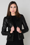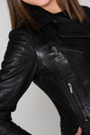 Denne sorte læder perfecto fra Rose Garden-mærket tilføjer noget ekstra til dit look. samlingen. Kvalitetslæderet og dets udseende giver en naturlig side. autentisk. Dens mellemlange, tætsiddende snit vil forføre dig.