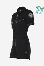 Denne model vil helt sikkert overraske elskere af trendy mode. Det er en kort playsuit, som fremhæver dine ben og er lavet i høj kvalitet. i formalet bomuld med den største omhu fra referencemærket Schott. De sølvmetalliske detaljer giver en elegant kontrast til den dominerende sort. De korte ærmer giver en speciel smag til dit outfit. dette produkt. Den kan tages på med en central lynlås. Brystlommerne har også lynlås. De broderede lapper på ærmerne tilføjer et meget moderne militært touch.