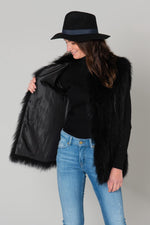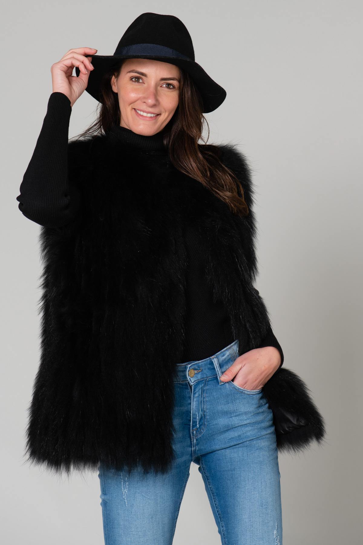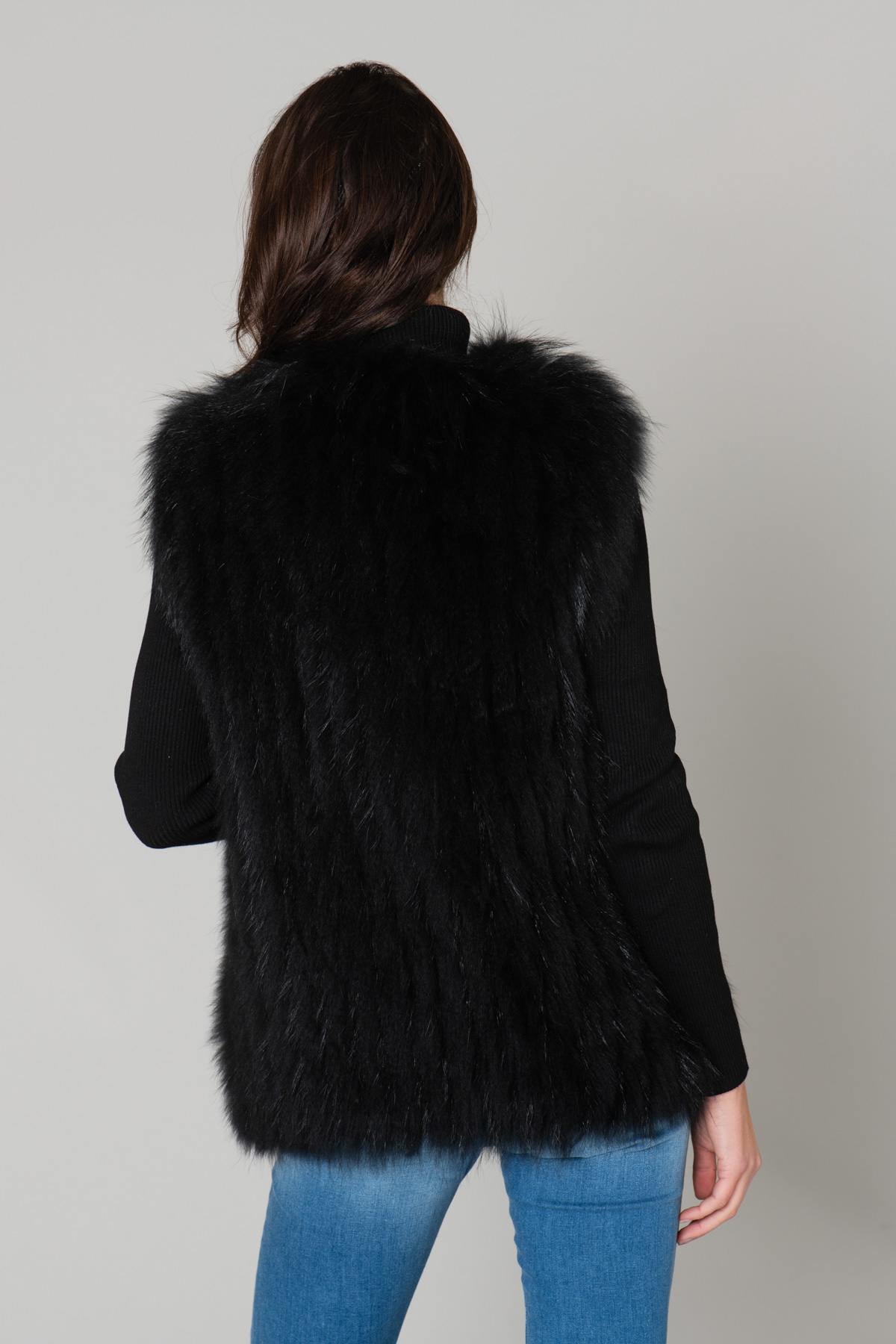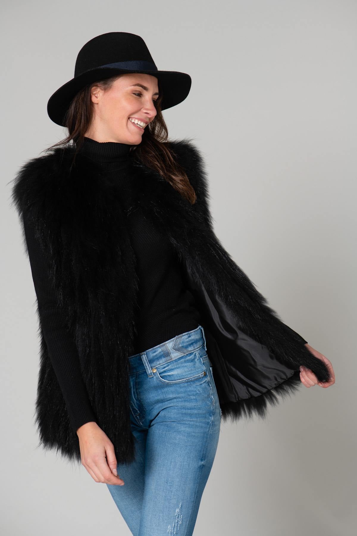 Ærmeløs og med et skjult lukkesystem er denne sorte pels så enkel, som den bliver. Du kan tage den på når som helst. inde i dine frakker for at holde dig varmere.