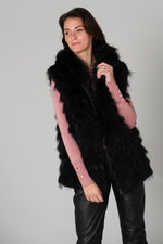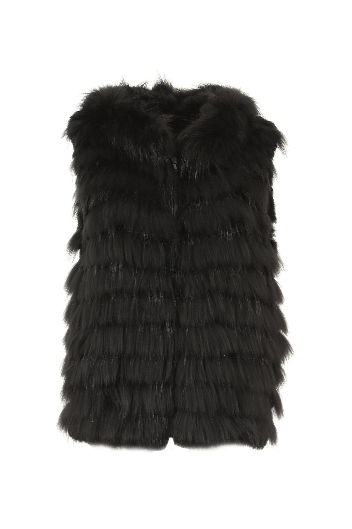 Sort i farven, den er ærmeløs, har en rund krave og en skjult knapstolpe. e med lynlås. Dens cascading-konfiguration giver den en unik charme.
