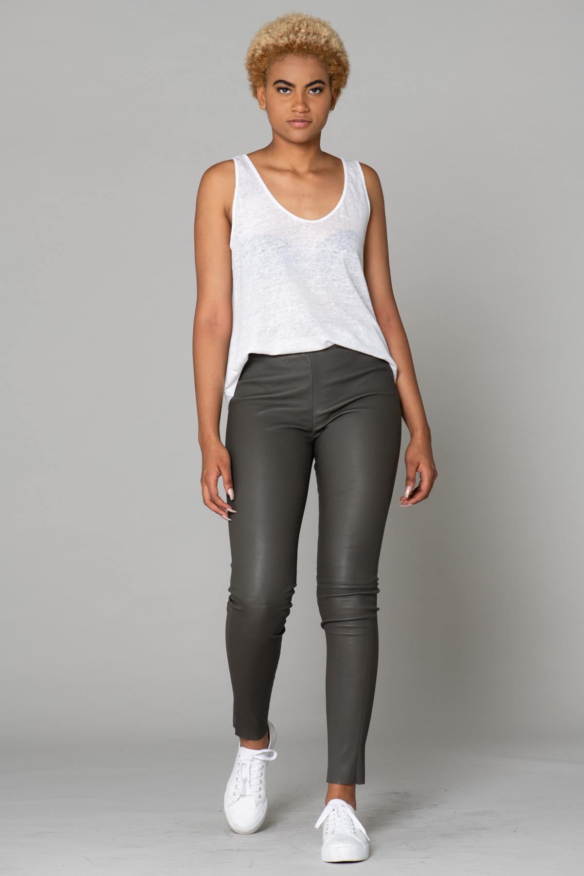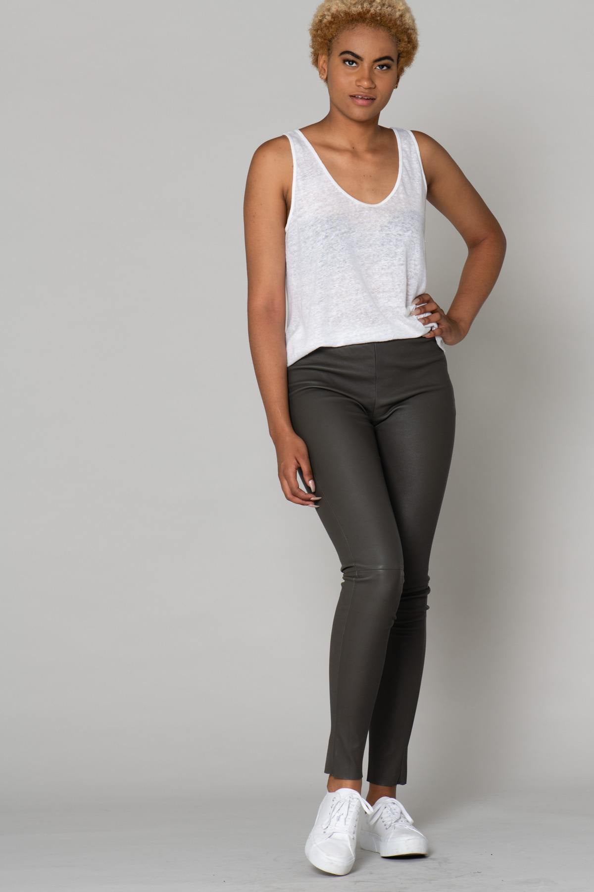 Den autentiske læderoverflade er glattet for et meget attraktivt visuelt resultat. Læderets finesse og blødhed giver et indtryk af generel velvære. Vi elsker siden af det. stræk og let, hvilket gør den til en rigtig anden hud, der er behagelig at have på. at bære. Silhuetten er fremhævet, femininiteten er forbedret. antaget. Dens alsidige kakifarve vil uden tvivl blive enstemmigt værdsat. nær toppen. På siden er en usynlig lynlås praktisk og ødelægger ikke æstetikken. Taljen er elastisk og sikrer optimal støtte. De sjældne og diskrete sømme fremhæver varens kvalitet. af arbejdet udført på læder.