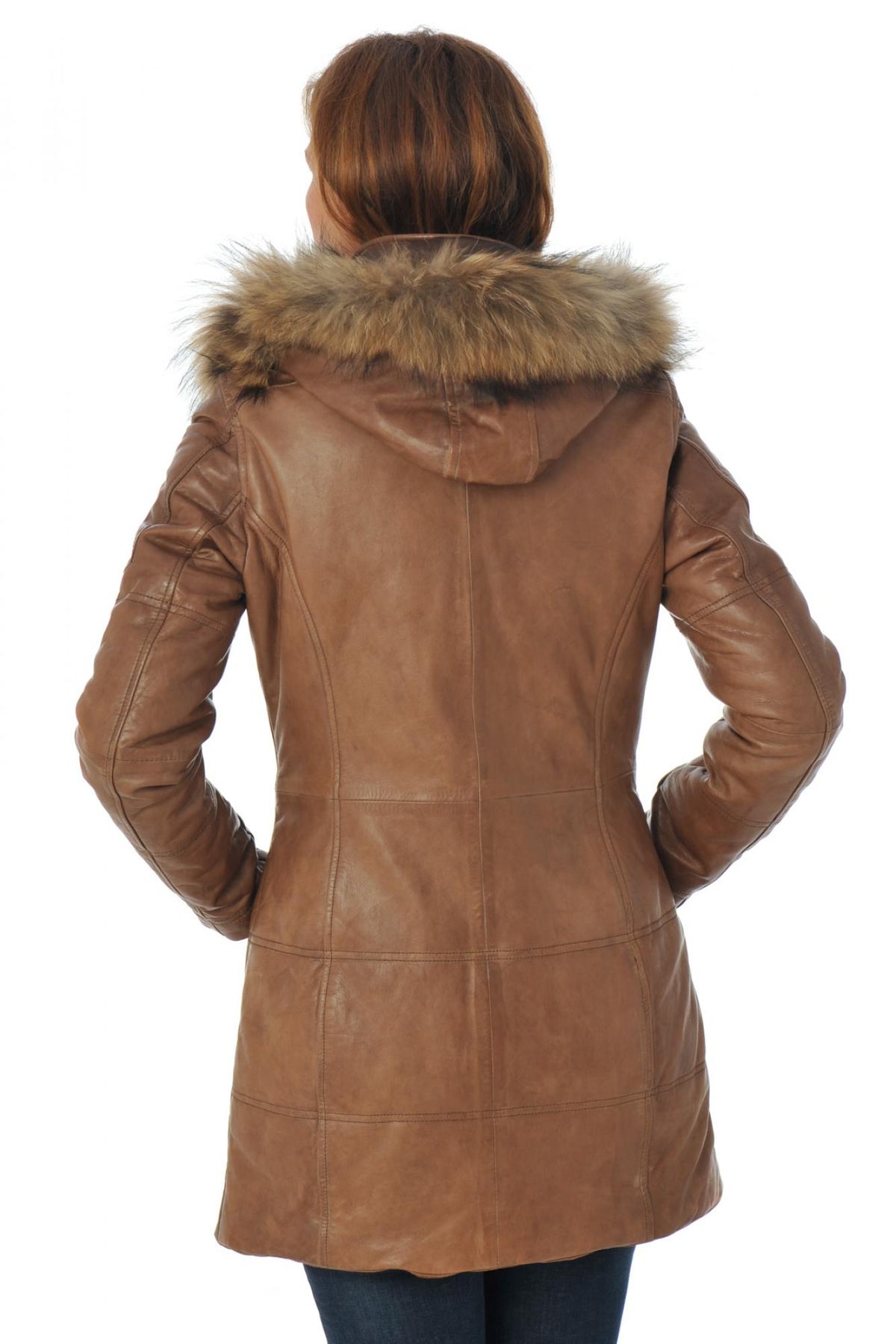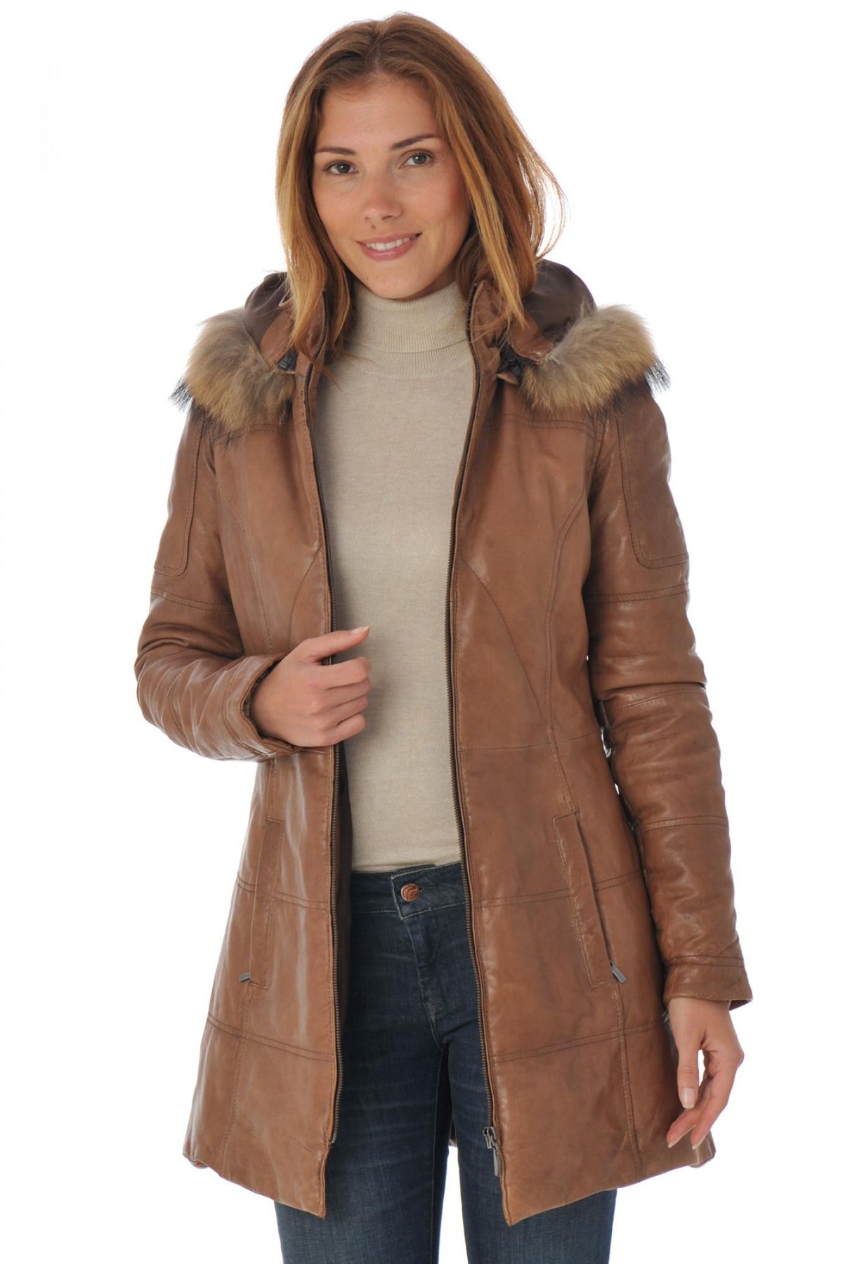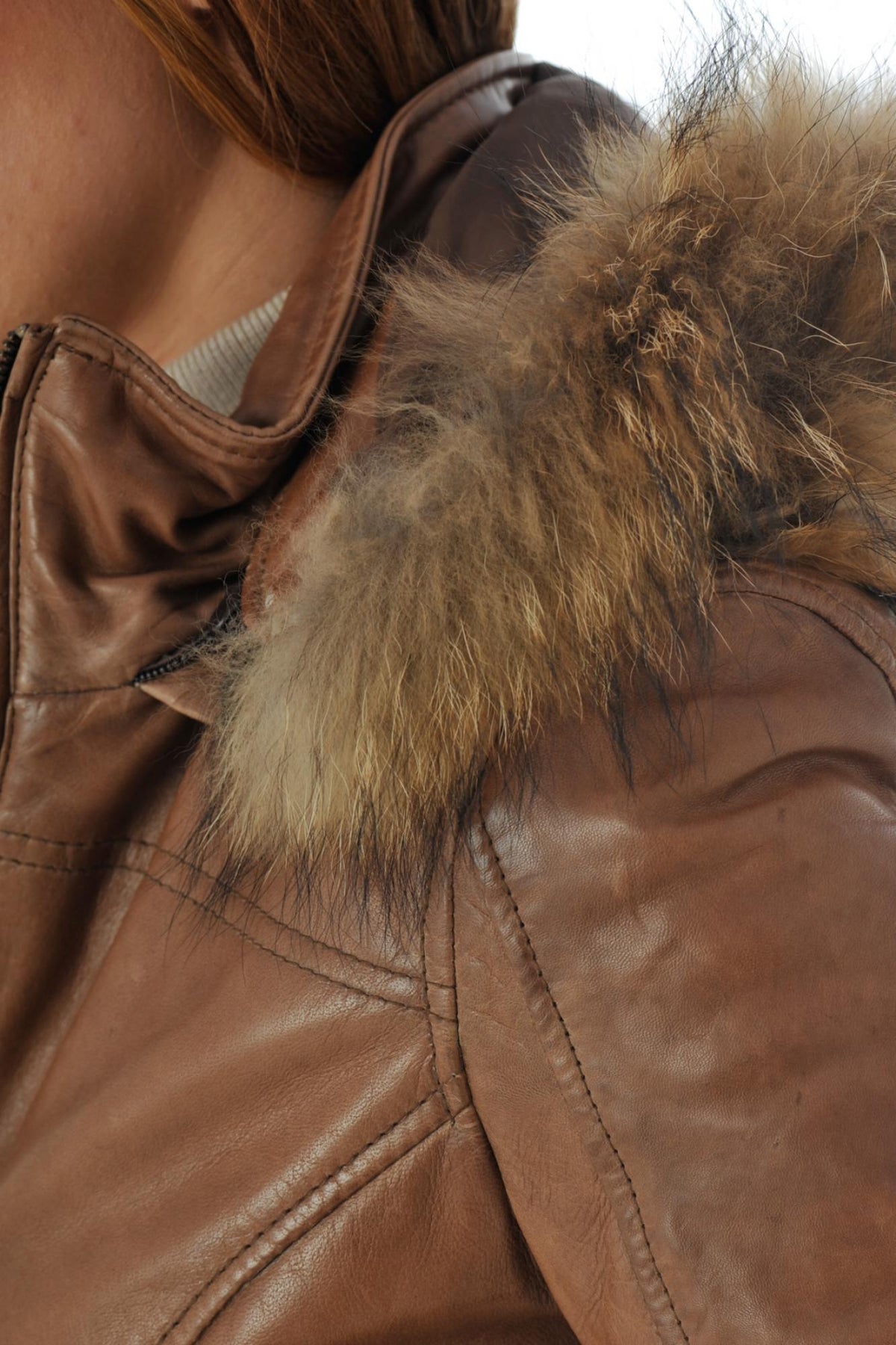 Aftagelig hætte med lynlås prydet med læder. vaskebjørnpels.