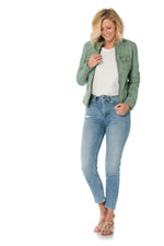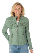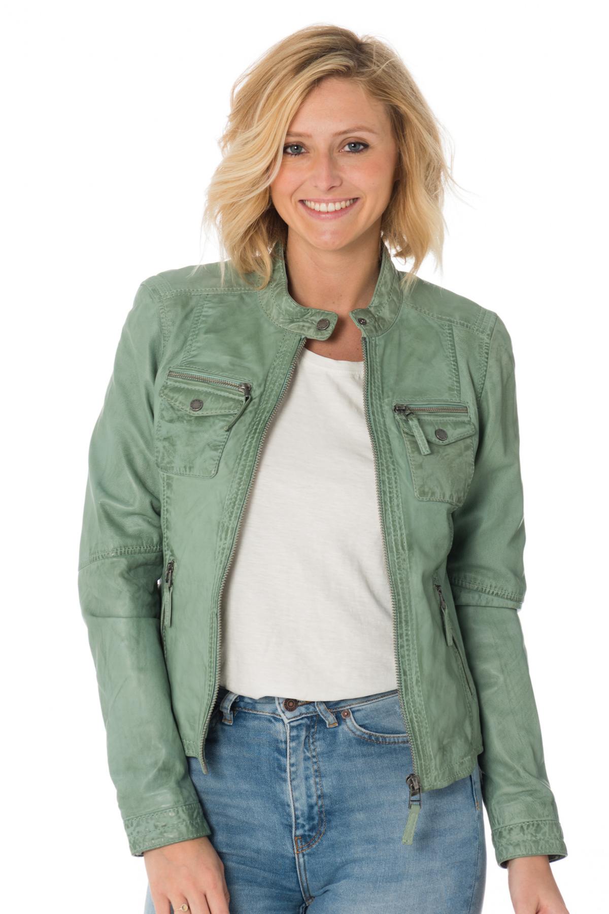 Denne model har en lysegrøn farve. rund hals med trykknapper har 2 dobbeltlommer på brystet og 2 sidelommer med lynlås foran og 2 indvendige lommer.
