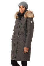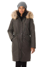 Storslået hætte, der kan tages af med lynlås, den er prydet med ægte vaskebjørnpels kan tages af med knap.