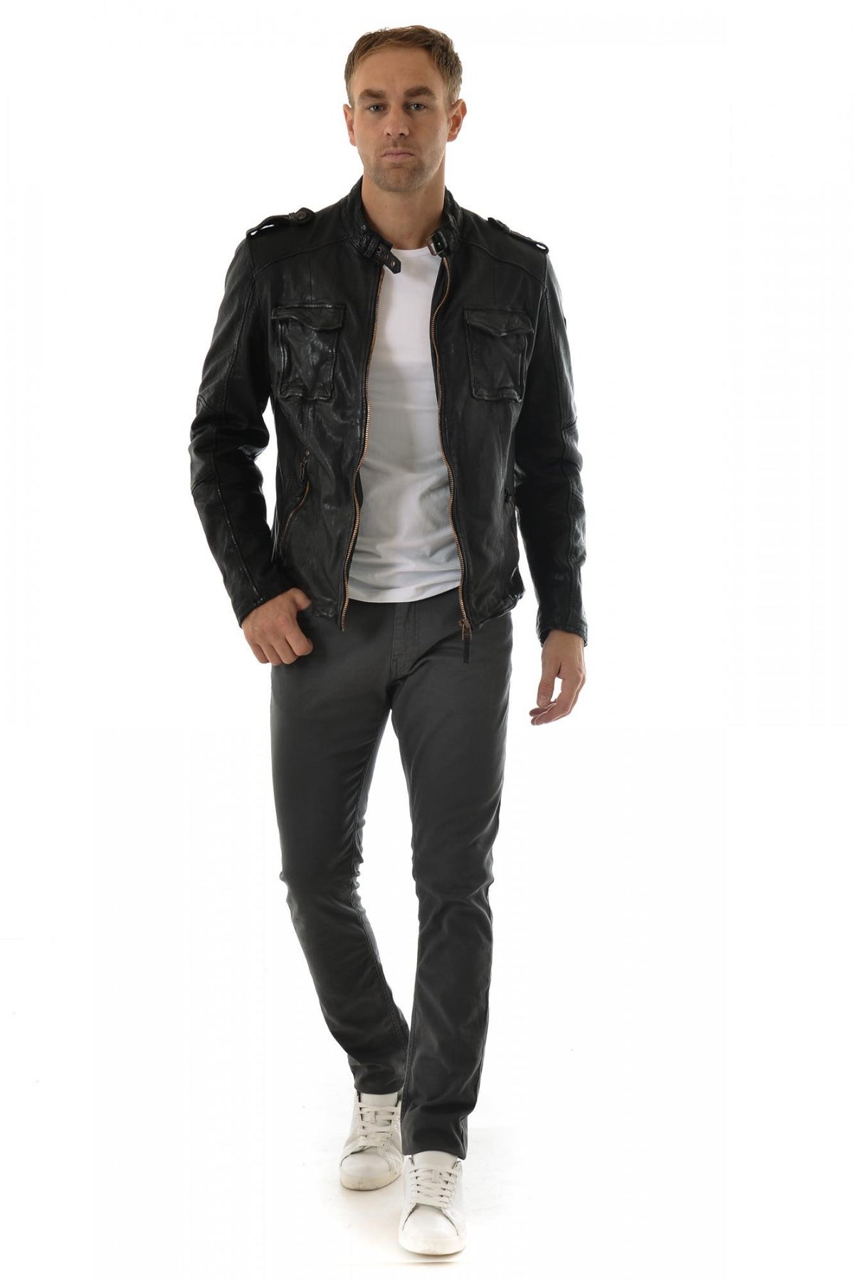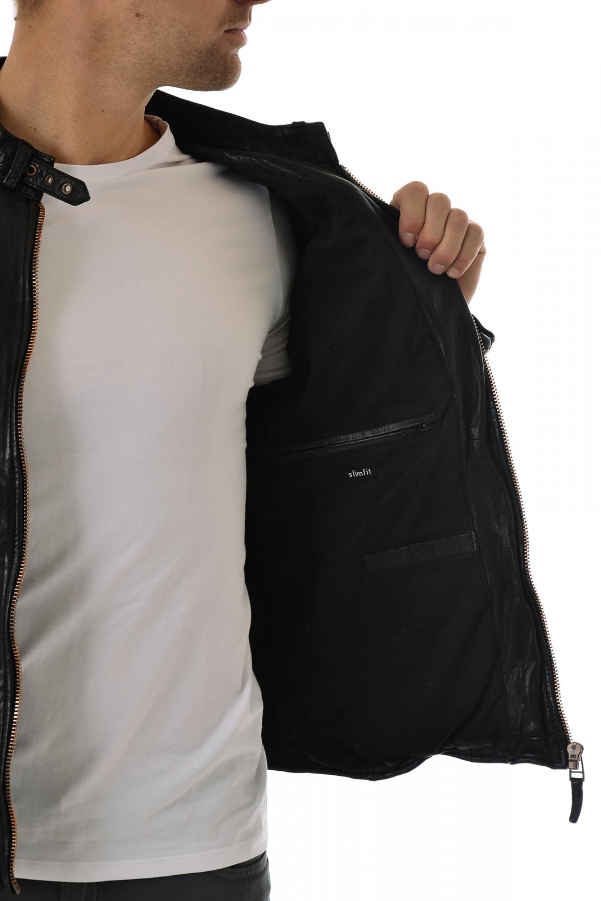 It is a close-fitting cut. The product will be fitted at the waist and the sleeves will be quite tight.<br><br> This type of jacket will be worn more easily open due to its fitted appearance.<br><br> The Slimfit cut is the most widespread among leather clothing, it is the fashionable cut!