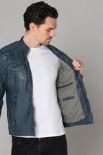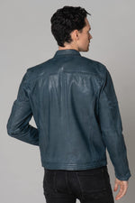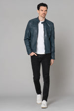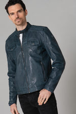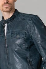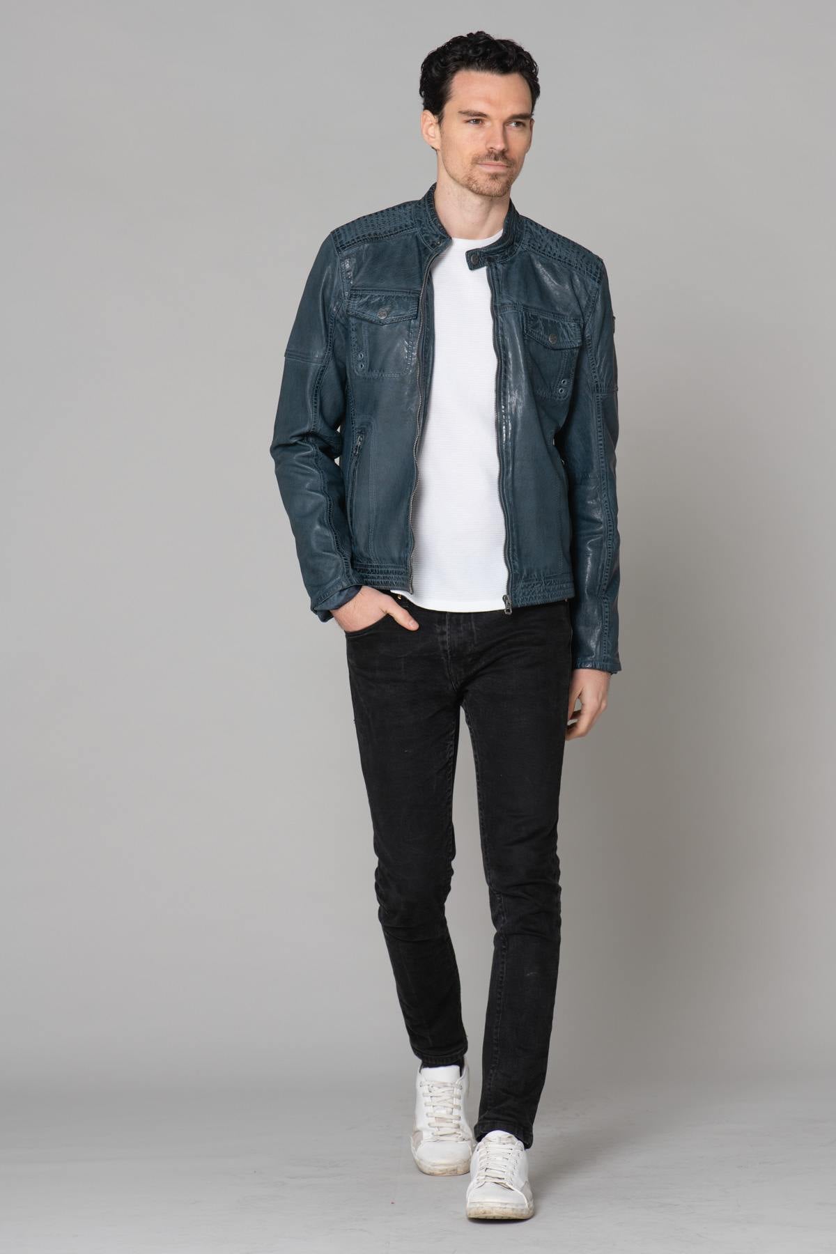 I sin blå farve respekterer den standarderne for en bikerkravejakke med bikerkrave udstyret med en bikerkrave. Den har en strop med trykknap, dens lange aksiale metallynlås og dens to sidelommer med lynlås. Brystet er dekoreret med to store lommer. knappet klap. Skuldrene er foret med bib-effekt og mærkets metalmedaljon er belagt. på venstre ærme.