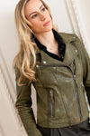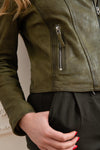 Ultra feminin, denne jakke er designet af fashionistas, til fashionistas. Vi finder al kreativiteten der. fra det franske referencehus. Det fårelæder, der bruges til fremstillingen, er af høj kvalitet, med en kakifarve, som bringer originalitet til udseendet. og autenticitet. Denne perfecto, som sidder normalt, har en krave med kærv; med dekorative sølvtryk. Den centrale lukning er asymmetrisk og med lynlås. De 3 lommer foran er også tilgængelige. lynlås. Hver af lynlåsene har en smuk lædertrækker. Den præcise syning kombineres med stoffet. en patineret overflade for et trendy og moderne look.