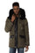 Høj krave med stropper med fast hætte og aftagelig pels med trykknapper (der medfølger en læderrem til at skjule knapperne).