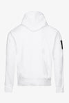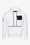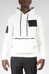 Sweatshirten har en elegant hætte med snøre med sølvspidser, der går gennem to metaløjer. Ærmerne er lange og fuldender et sporty look. Manchetter og talje er i størrelse. Ribbede kanter. Forsiden af ​​jakken har en stor lomme, der passer ind i det trendy design. og som lukkes med en lang gylden metallisk lynlås. Et emblem er syet på højre arm, mens Horspist fornyer sig på brystet med et teknisk logomærke, der kan tages af med velcro. Umuligt at modstå brandingen varme fra fløjlspanelet, som afslører logoet i relief over hele overfladen.