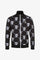 Vi finder et højkvalitets åndbart teknisk stretchstof. hvis hele overfladen er printet med hvide Jason-masker på sort baggrund. Vi genkender der; inspiration hentet fra mærkets ikoniske t-shirt. Kraven er rund og afslører en tofarvet snøre, der krydser 2 guldøjer. Livmoderhalsen er dannet ribbede kanter. Det samme gælder manchetterne på de lange ærmer og taljen. Det metalliske våbenskjold logotype Horspist er tacklet i brysthøjde, side af brystet til VENSTRE. To sidelommer er synlige i bunden af tøjet.