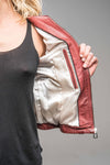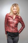 ROSE GARDEN-mærket udelukkende dedikeret til kvinder præsenterer sin ETHEL LAMB RUBY REDWINE-jakke. En biker-krave lavet i fint, smidigt, let og blødt lammeskind. Den er foreslået i et slankt snit, der fremhæver din storslåede feminine silhuet.